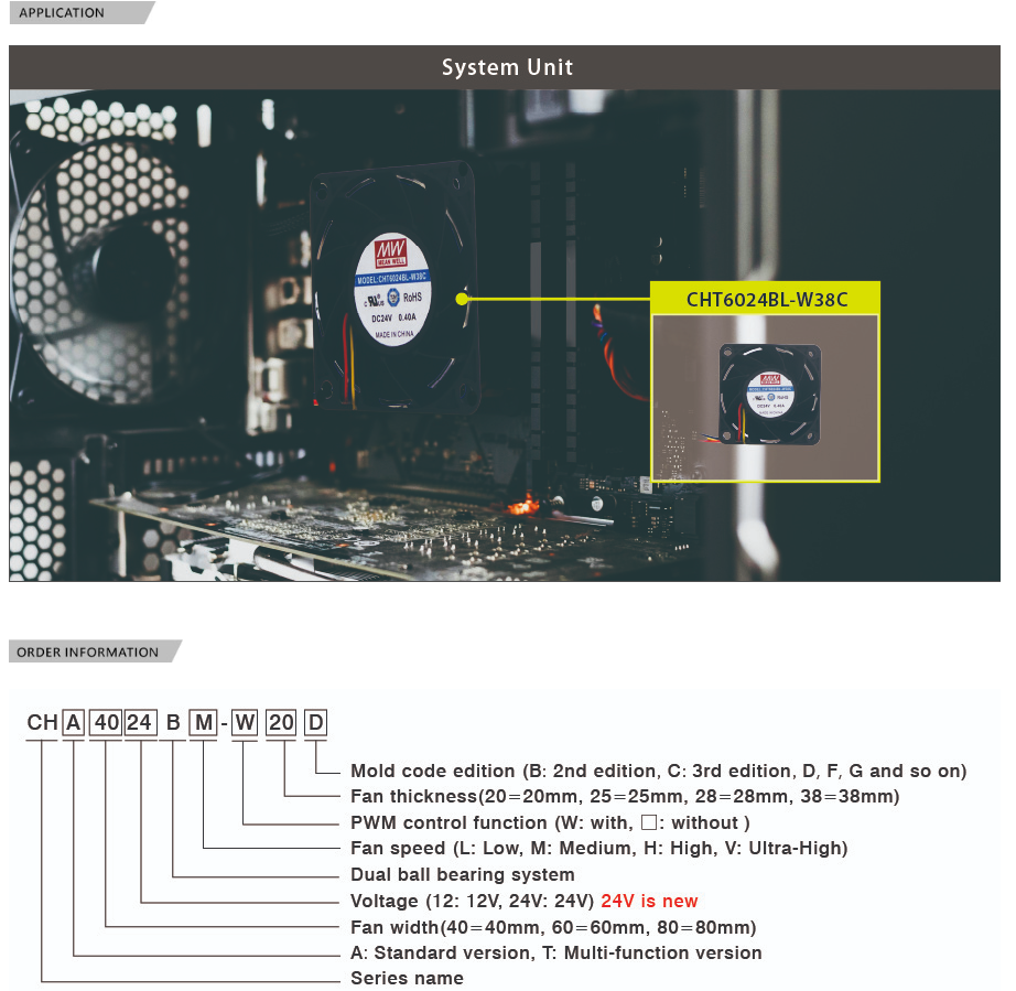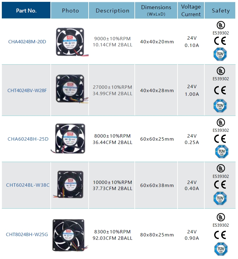 글로벌 전압 애플리케이션에 대한 수요 증가에 대응하여, PowerNex는 기존의 12V DC 팬 제품 라인을 기반으로 MEAN WELL 브랜드의 24V DC 팬인 CH 시리즈를 공식 출시했습니다.
